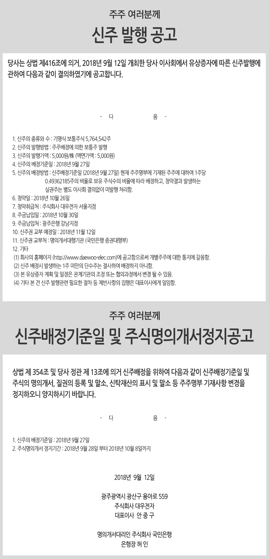 | 223 | 기업 신주 발행 공고 & 신주배정기준일 및 주식명의개서정지공고 | 2018-09-12 |