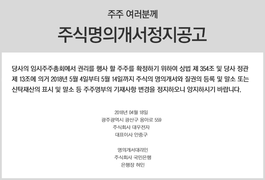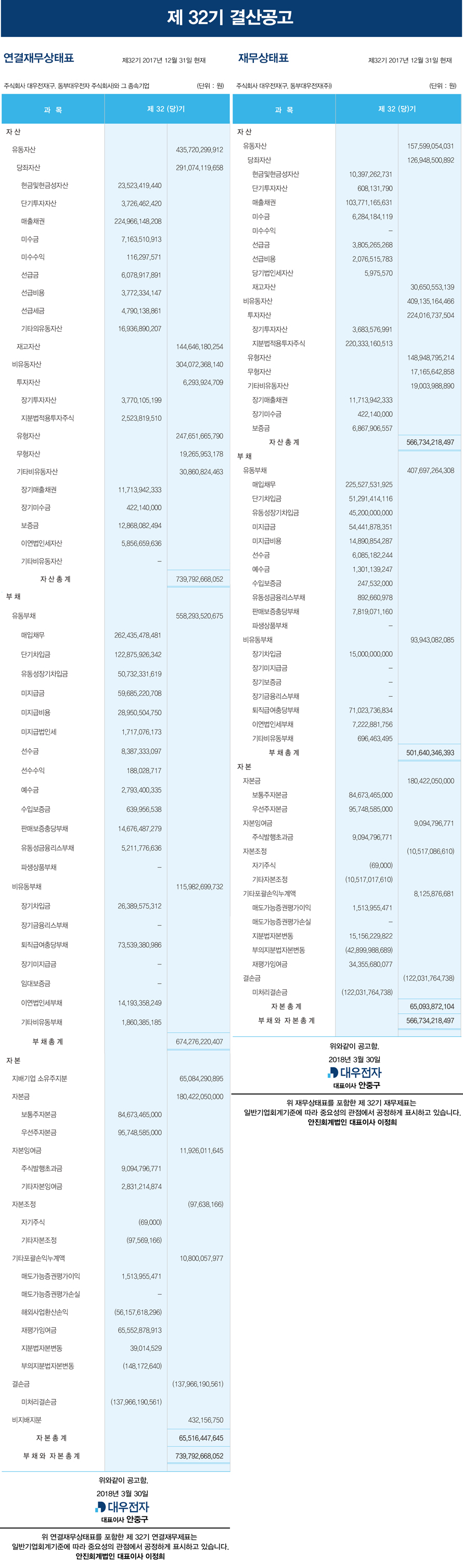 | 199 | 공고 대우전자, 제 32기 결산공고 | 2018-03-30 |