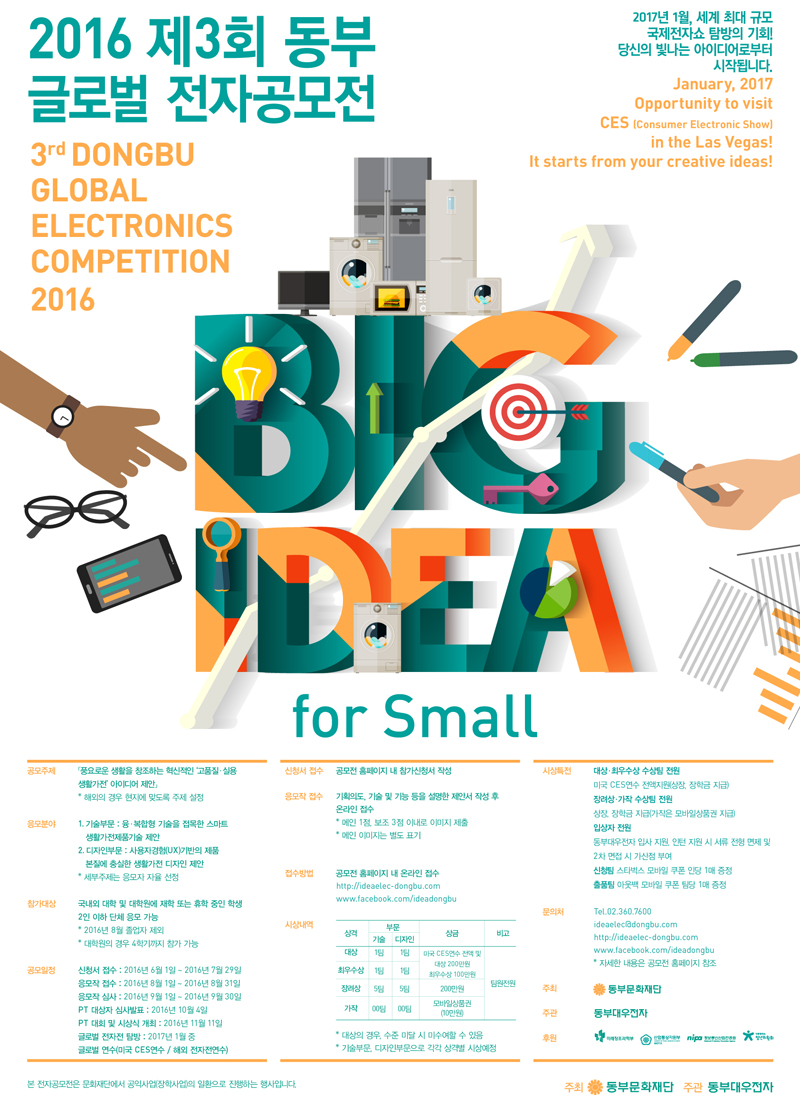 전자공모전 관계자는 “전세계의 전자산업은 중국 등 신흥국가의 성장으로 무한경쟁시대에 돌입했다”며, “동부 글로벌 전자공모전이 대한민국 전자산업의 미래를 위해 창의적인 인재가 발굴될 수 있도록 조금이나마 보탬이 되었으면 한다”고 말했다. |