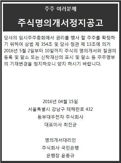 | 101 | 기업 주식명의개서정지공고 | 2016-04-15 |