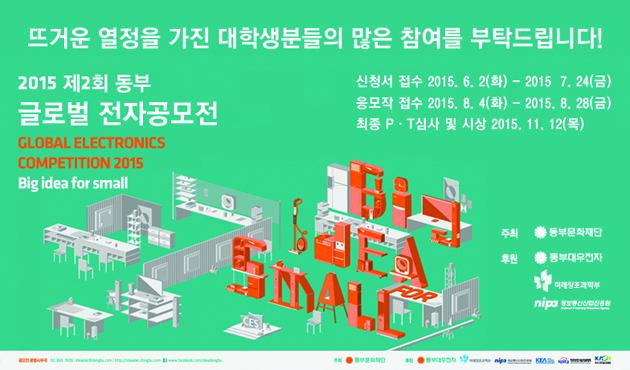 ![]() 동부문화재단, ‘제 2회 동부 글로벌 전자공모전’ 개최 - 대상 2팀 CES 연수, 혁신상 4팀 일본전자전 연수 등 총 2억원 시상 - 7월 24일까지 홈페이지(ideaelec.dongbu.com) 통해 신청 동부문화재단(이사장 강경식)은 4일 국내외 대학생 및 대학원생을 대상으로 ‘제 2회 동부 글로벌 전자공모전’을 개최한다고 밝혔다. 이번 공모전은 동부문화재단이 주최하며 동부대우전자, 미래창조과학부, 정보통신산업진흥원, 한국전자진흥회, 한국산업기술협회, 한국스마트홈협회 등이 후원한다. 이번 공모전은 글로벌 전자산업의 주역이 될 젊은 인재를 육성에 도움이 되고, 창의적인 가전 아이디어를 발굴해 전자산업 발전에 기여한다는 취지로 진행된다. 최진균 동부대우전자 부회장은 “IoT로 대표되는 미래사회에서는 여러 사물을 묶어 다각도로 조망하고 분석함으로써 새로운 사용자 가치와 시장을 창조할 수 있는 혁신 아이디어가 중요하다”며, “이번 공모전이 대학생들의 창의적인 아이디어가 현실화되는 기회가 되길 기대한다”고 말했다. 공모전의 주제는 ‘풍요로운 생활을 창조하는 혁신적인 미래 생활가전 아이디어 제안’이다. 응모부문은 기술부문, 디자인부문이며, 응모자는 각 부문에서 사물인터넷(IoT) 융복합 스마트 생활가전, 백색가전에서 파생된 헬스케어 제품 등에 대해 세부주제를 선정하여 참가하면 된다. 이번 공모전의 시상 규모는 약 2억 원이며, 작년 1회 때보다 수상자(또는 팀)의 수를 두 배로 늘려 총 16팀에 대해 시상한다. 기술부문, 디자인부문별로 대상 1팀에게는 미국 라스베이거스에서 열리는 세계 최대 가전 쇼 CES 전시회 참관을 포함한 연수비용 전액을 지원한다. 각 부문별 혁신상 2팀에게는 일본 전자전 연수 기회를, 장려상 5팀에게는 200만원의 상금을 각각 시상할 예정이다. 또 입상자 전원에게는 동부대우전자 입사 지원 시 서류전형 면제와 면접 시 가산점을 부여하는 등 다양한 혜택이 주어진다. 이번 공모전에는 국내외 대학(대학원)에 재학 중인 개인 또는 2인 이하의 팀으로 참여할 수 있다. 참가를 원하는 학생들은 7월 24일까지 공모전 홈페이지(ideaelec.dongbu.com)를 통해 신청할 수 있다. 자세한 내용은 홈페이지 또는 공모전 운영 사무국(02-360-7600)으로 문의하면 된다. 작년 1회 공모전에는 총 740개 팀이 열띤 경합을 벌여 미닫이 냉장고 ‘밀다’, 이동형 초소형냉장고 ‘리볼버’, 초소형 전자레인지 ‘소담’ 등 대학생 특유의 혁신적인 아이디어들이 제안된 바 있다. |