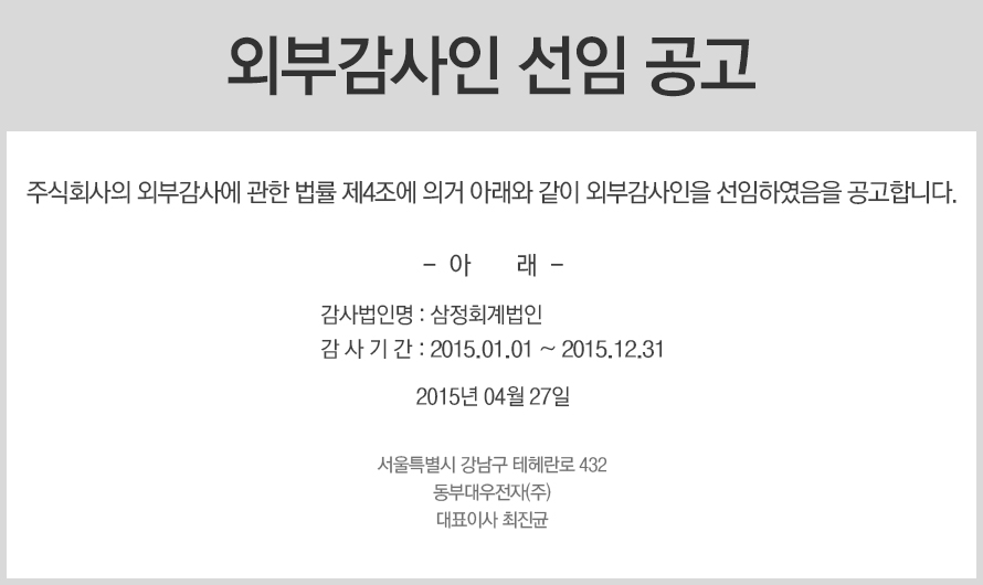 | 63 | 기업 외부감사인선임공고 | 2015-04-27 |
