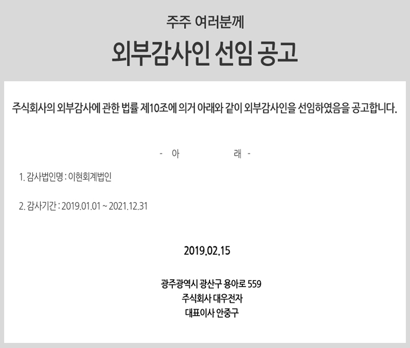 | 243 | 공고 대우전자, 제 33기 결산공고 | 2019-04-12 |